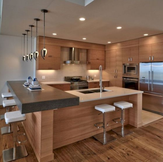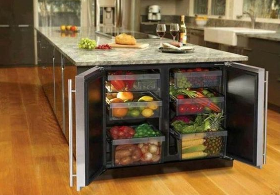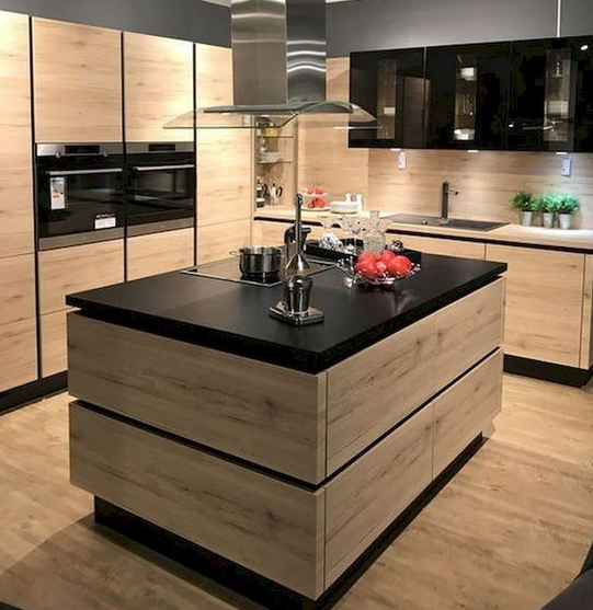 Такой вариант планировки гармонично будет смотреться, если в комнате довольно много свободного пространства. И вы увидите, как сразу изменится настроение помещения. Ведь кухонный остров не только делает вашу кухню теплее, гостеприимнее и атмосфернее, занимая центральное место, но и помогает вам значительно увеличить место для хранения кухонной утвари и продуктов. Более того, в шкафы под островом можно встроить даже холодильник-тумбу и морозильную камеру, что может значительно сэкономить место и сделать визуально вашу кухню более легкой.